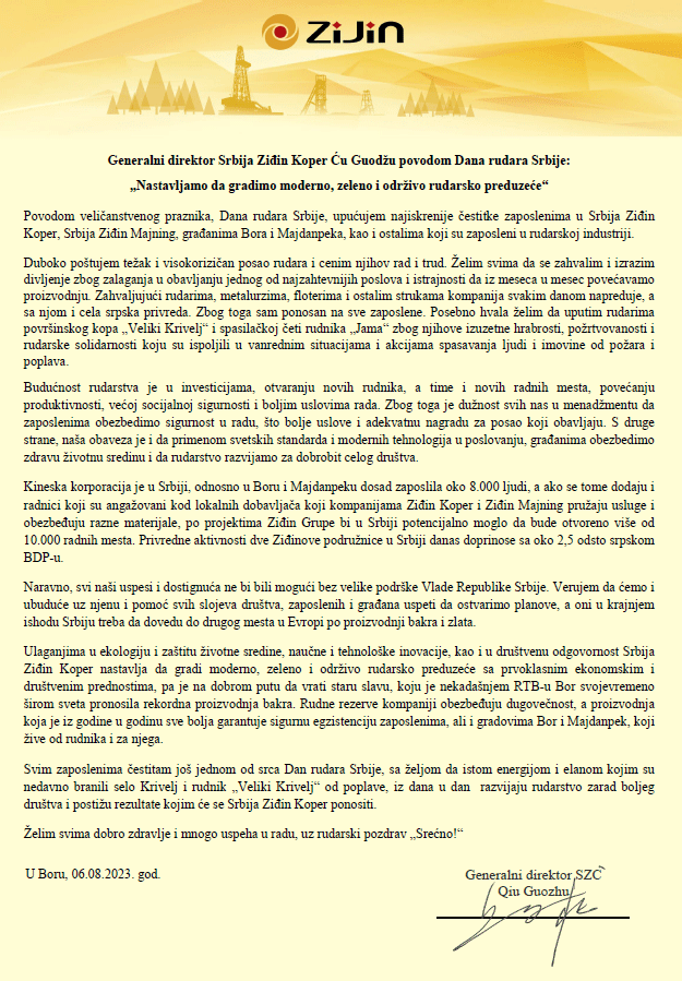 Свим запосленима честитам још једном од срца Дан рудара Србије, са жељом да истом енергијом и еланом којим су недавно бранили село Кривељ и рудник „Велики Кривељ“ од поплаве, из дана у дан развијају рударство зарад бољег друштва и постижу резултате којим ће се Србија Зиђин Копер поносити.