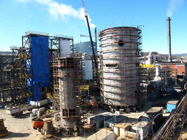 . – Без обзира на све неповољније време које доноси ово доба године, на градилишту нове топионице и фабрике сумпорне киселине радови добро напредују и коначан изглед појединих постројења већ је видљив. Како нам рече директор градилишта Душан Марковић ради се на пећи, филтеру, котлу и бројним другим позицијама. Поставља се опрема и надграђују основни конструкциони системи, па би детаљна прича о свему била једнака напору да се опише милион делова једног авиона. Мада се најављује снег, на градилишту не очекују застоје јер су бетонски радови завршени и сада се монтира опрема. А, много тога је могуће урадити и по хладнијем времену. Заваривање, на пример, могуће је до минус пет степени. Пристигла је готово сва опрема (97 одсто), па уз максималну координацију послова на градилишту и у оближњим погонима који производе бакар, градитељи грабе ка циљу да топионицу заврше наредне године. Негде иду брже, негде спорије, али се углавном држи темпо којим треба да се стигне до циља.