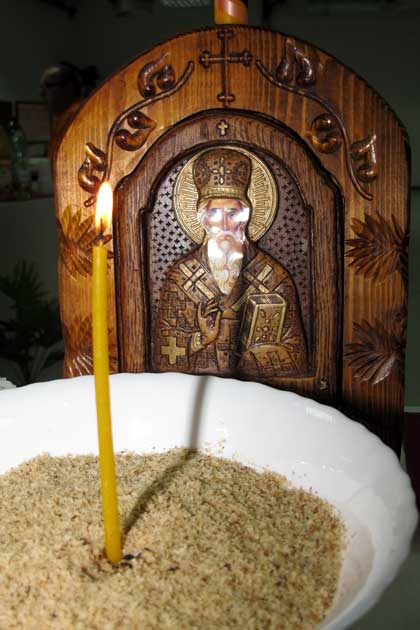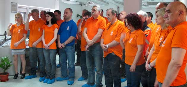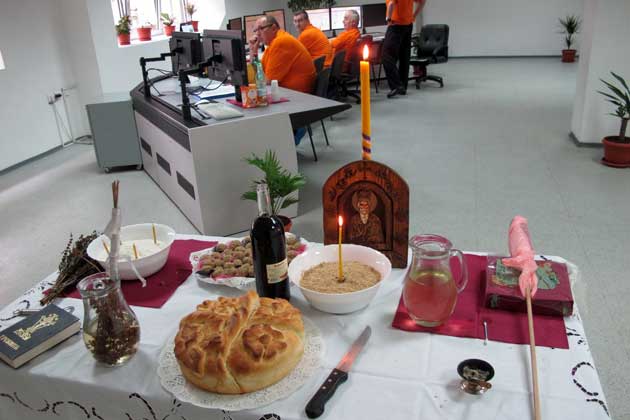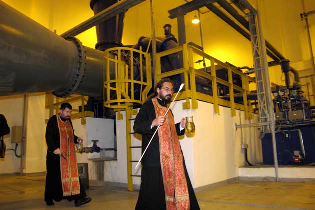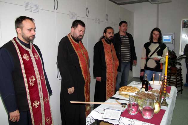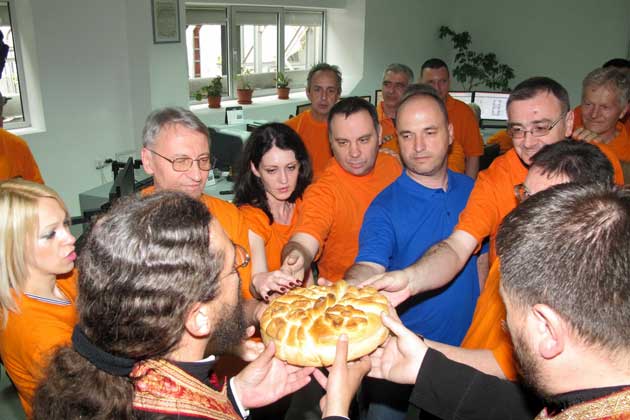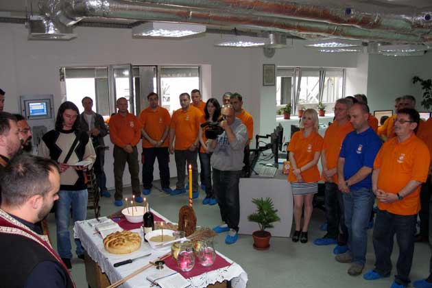 НОВА ТОПИОНИЦА. – Крсну славу у част Светог Василија Острошког који је, како рече протојереј Саша Степановић, заменик старешине борске цркве Свети Ђорђе, један од најпоштованијих светитеља у нашем народу, можда одмах после Светог Саве, запослени у новој топионици обележили су данас резањем славског колача у командној соби фабрике сумпорне киселине. Том чину претходио је обред освештања свих погона у саставу нове топионице почев од бединга, конверторског дела, флеш-пећи и нове енергане, до фабрике сумпорне киселине и свих њених пратећих постројења.