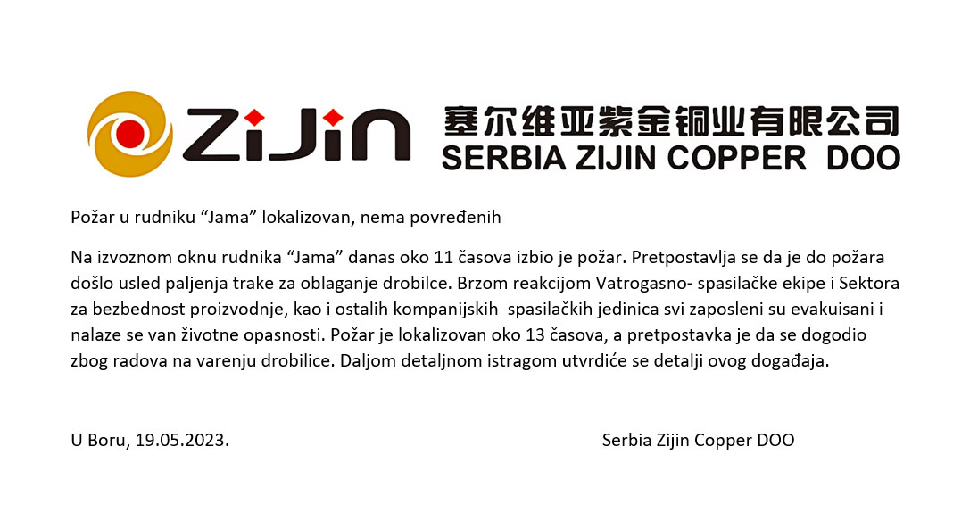 На извозном окну рудника “Јама” данас око 11 часова избио је пожар. Претпоставља се да је до пожара дошло услед паљења траке за облагање дробилце. Брзом реакцијом Ватрогасно- спасилачке екипе и Сектора за безбедност производње, као и осталих компанијских спасилачких јединица сви запослени су евакуисани и налазе се ван животне опасности. Пожар је локализован око 13 часова, а претпоставка је да се догодио због радова на варењу дробилице. Даљом детаљном истрагом утврдиће се детаљи овог догађаја.
