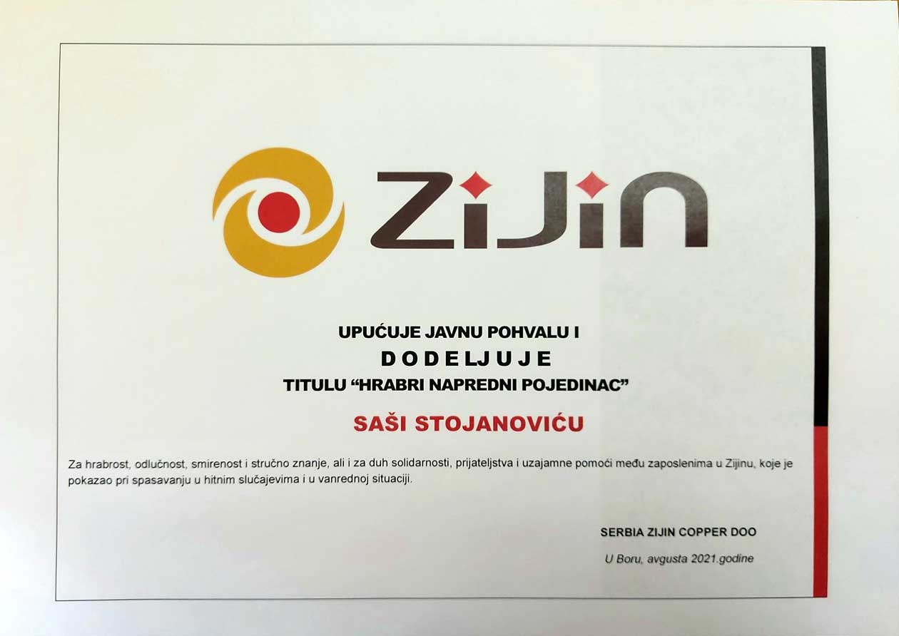 SZC. – За храброст, одлучност, смиреност и стручно знање, али и за дух солидарности, пријатељства и узајамне помоћи међу запосленима у Serbia Zijin Copper, које је показао при спасавању у хитним случајевима и у ванредној ситуацији, Serbia Zijin Copper је Саши Стојановићу упутила јавну похвалу, доделила му титулу „храброг напредног појединца“ и наградила га са 15 хиљада динара.
