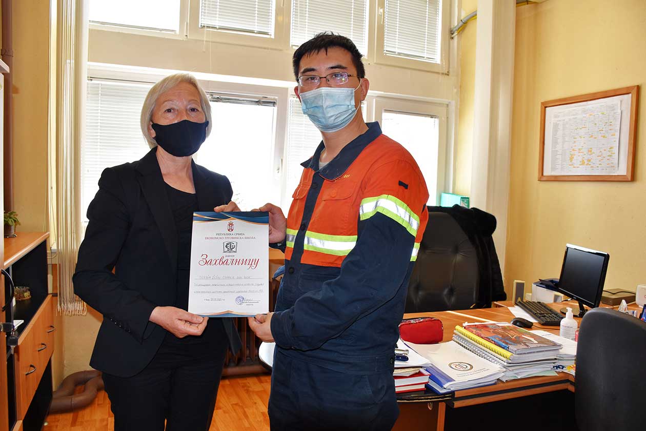SERBIA ZIJIN COPPER. – Да дубоко цени сваки гест Компаније и пружену безрезервну помоћ у решавању било ког проблема „у доба короне“, Економско-трговинска школа у Бору показала је (9. априла) организацијом пријема за делегацију Serbia Zijin Copper. Директор ове борске средње образовне установе Светлана Радосављевић том приликом је шефу Кабинета генералног директора Hongzi Wenu уручила захвалницу за донацију заштитних средстава и опреме у циљу спречавања ширења епидемије.